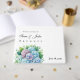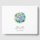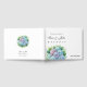 This guest book is shown in a lovely hydrangeas floral print on the front and back of the book. Personalized names and wedding date shown in a black color. Backside has a same hydrangeas image along with personalized names and date near bottom.