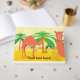 Este camello cuenta con dos camellos en el desierto cerca de algunas palmeras.