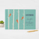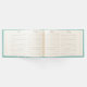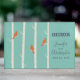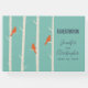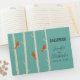Un libro de firmas de boda con una ilustración de abedules con pájaros naranja posados en sus ramas. Fondo verde retro.