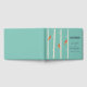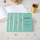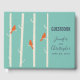 Un libro de firmas de boda con una ilustración de abedules con pájaros naranja posados en sus ramas. Fondo verde de estilo retro.