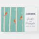 Un libro de firmas de boda con una ilustración de árboles de abedul con pájaros naranjas posados en sus ramas. Fondo verde de estilo retro.
