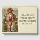 Esta es una hermosa imagen vintage de Jesús sosteniendo la Eucaristía rodeada de cantos y flores. Un cáliz dorado está en primer plano.