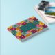 This vibrant wedding guest book cover features a lively floral pattern with large, stylized flowers in shades of pink, yellow, orange, and teal arranged in a grid-like layout. The central dark teal frame with gold accents highlights customizable text for names and dates, set against the colorful backdrop. The design combines modern typography with playful, abstract florals to create an energetic yet sophisticated aesthetic, perfect for celebrating joyous occasions like weddings.