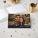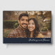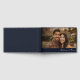 This wedding guest book cover features a warm, inviting design with a photograph of two individuals in an outdoor setting, surrounded by autumnal tones and soft lighting. The lower section showcases a deep navy blue band with elegant cursive typography for personalized names, adding a touch of sophistication. The overall style is contemporary yet timeless, perfect for capturing the joy and connection of a special occasion like a wedding or engagement. Its minimalistic approach emphasizes intimacy and personalization, making it a meaningful keepsake for guests to contribute their well-wishes.