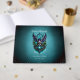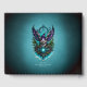 Lechuza con elementos mágicos. El diseño se caracteriza por un impresionante búho estilizado con sus alas extensas, diseñadas en una vibrante paleta de colores morados, azules y blancos. El búho exuda una presencia majestuosa, mientras sus ojos penetrantes amarillos miran directamente al espectador, creando un sentido de intensidad y misterio. Patrones intrincados y giratorios se despliegan alrededor del búho, reminiscentes de los símbolos mágicos, dando a la imagen general un aura mística.