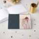 This elegant wedding guest book features a soft, romantic design with a split layout combining a dark navy cover and a warm-toned photo area. The typography is stylish and modern, adding a touch of sophistication to the overall look. With its gentle color palette and intimate mood, this guest book captures the essence of love and celebration, making it perfect for commemorating special moments at your wedding. It invites guests to leave heartfelt messages in a setting that feels both personal and timeless.
