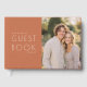 This wedding guest book features a warm and inviting design with a soft, earthy color palette that exudes romance and elegance. The cover showcases a photo area surrounded by tasteful typography, creating an intimate space for guests to leave their heartfelt messages. The gentle hues of terracotta and cream complement the natural outdoor setting depicted in the photo, evoking feelings of joy and celebration. Perfect for capturing memories from your special day, this guest book adds a personal touch to any wedding decor while providing a cherished keepsake for years to come.