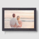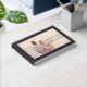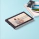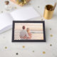 This wedding guest book features a romantic photo design with a soft, dreamy finish that captures the essence of a serene beach sunset. The layout is elegantly framed in black with gold typography, adding a touch of sophistication and warmth to the overall aesthetic. Perfect for couples who cherish intimate moments by the sea, this design evokes feelings of love and tranquility, making it an ideal keepsake for guests to sign on your special day.