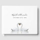 Sencillo y elegante. Dos hermosos cisnes enamorados doblando la cabeza juntos y formando un corazón. Fondo blanco y elegante. Plantilla para los nombres de la novia y del novio y fecha del boda. Cartas negras. Los nombres se escriben con una escritura de estilo con letras a mano moderna. Una pareja de cisnes se queda unida de por vida, así que son el símbolo perfecto del amor. Plantilla para un texto en la columna vertebral.