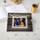 Un hermoso fondo marrón con textura de madera falsa tiene un gran marco de foto blanco ornamentado en el que hay luces de cadena en la parte superior que parecen brillar. Una plantilla de letra caligráfica para el nombre de la pareja aparece en el borde inferior de la foto. Las fotografías con fondo oscuro funcionarán mejor con este diseño simple pero llamativo.