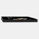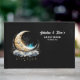 Una maravillosa y vibrante luna creciente de marfil en 3D, con una decoración giratoria y pequeñas lunas azul pálido sobre ella, descansa sobre nubes grises y esponjosas que tienen pequeñas formas de diamante colgadas de ella, y aparece en el fondo negro de medianoche que se puede cambiar a cualquier color que se elija. Las plantillas blancas editables aparecen a su derecha para la redacción de su personalizado. Ideal para una luna y un boda de estrellas, para su aniversario con temática estrellada o para cualquier negocio en mimbre, lodge o resort.