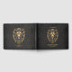 Majestuosa cabeza de león dorada con mané negro. Los detalles artísticos en la cara para enfatizar la fuerza y la gracia del animal. Esta combinación de oro y negro le da al diseño un toque elegante y lujoso.