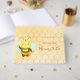 Elegante, divertida ducha de bebé de verano celebrando a una niña o neutral de género. Fondo amarillo y blanco con un patrón de peine de miel. Decorada con una linda y feliz abeja sonriente sosteniendo una sonrisa. Con el texto: Mami to Bee escribe con una escritura de estilo moderno con letras a mano. Plantilla para el nombre de la mamá. Letras marrones y rojas. Spine: agrega tu propio texto: Atrás: patrón de honecas.
