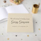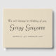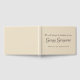 Este libro de visitas para funerales/conmemoraciones presenta el mensaje "Siempre estaremos pensando en ti", y el nombre personalizado y las fechas de nacimiento/muerte de la persona que ha fallecido. El texto es de color negro y el fondo es de color beige. Se podría usar para registrar recuerdos aficionados de alguien que ha fallecido recientemente.