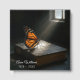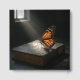 Una mariposa monarca con un naranja vibrante y alas negras descansa sobre una Biblia Santa gastada iluminada por un suave pozo de luz desde una ventana cercana para un funeral o un servicio conmemorativo. Se puede cambiar todo el texto.