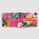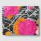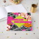 Forma de diamante neón amarillo sobre naranja rosa y melocotón floral moderna con diseño marbleizado oscuro. Nombres en neón amarillo sobre barras rosadas calientes. El texto restante es negro.