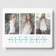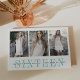 Invite a sus dulces 16 cumpleaños a compartir sus deseos y recuerdos con este libro de moda, que incluye tres de sus fotos favoritas alineadas una al lado de la otra. "Dieciséis" aparece debajo de una vibrante letra turquesa acuática, con una superposición de tu nombre y fecha fiesta. Añadir una foto adicional de sangrado completo a la cubierta trasera.