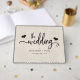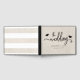 Este moderno libro de bodas presenta una tipografía rústica al estilo de una casa de campo con pequeños corazones sobre un fondo de madera blanca. La parte trasera tiene un diseño de rayas blancas.