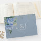 Moda y elegante libro de bodas en blanco roto en un estilo moderno y juvenil con hortensias azules voluptuosas en flor. La parte delantera incluye nombres de pareja e iniciales con fecha blanca y boda, con un polvoriento fondo azul. La columna vertebral muestra el texto "nuestro libro de visitas boda", también en gris oscuro. Un bigote hermoso y especial. Personalice este diseño especial y único para convertirlo en su propio toque personal.