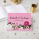 Una margarita rosa claro y rosa oscuro crean una hermosa exposición en esta viña rústica. Una flor blanca y redondeada no la hace demasiado rosa. ¿Hay algo así? El fondo rosa rosa rosado añade textura y la hace muy chica y femenina. El abrupto tipo de letra usado para los nombres de la pareja boda se suma al ambiente bohemio. La fecha del boda es la siguiente.