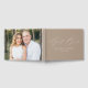 Elegante libro de bodas con "Guest Book" presentado en un moderno guión de caligrafía blanca sobre fondo de taupe. Personalice la parte delantera del sencillo libro de bodas con sus nombres y fecha de boda. La parte posterior del libro de visitas taupe muestra su foto de compromiso horizontal. Añade tu nombre de matrimonio y fecha de boda a la columna vertebral del libro de invitados.
