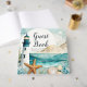 Beautiful birthday party guest book with a nautical black and white lighthouse, starfish and shells. Perfect for a birthday party. The words can be changed to suit your own details or requirements