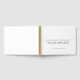 Un sencillo libro de invitados tipográfico minimalista moderno que presenta los nombres de la novia y el novio en escritura dorada y el apellido casado en tipo serif negro.
