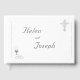 Design front features a white background to names of couple displayed in a elegant silver-colored Nuptial font in center. Image of a silver crucifix is featured in top right corner. Lower left corner displays the images of a chalice with suspended Host beside joined wedding rings.