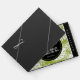 Un libro de bodas con un patrón repetido de hojas grandes de palma sobre un fondo verde oliva. Moderno y tropical. Un círculo negro con un borde interior dorado sobre la parte superior con tus detalles personalizados en el interior.