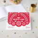 Celebre su quinceañera con este diseño tradicional de papel picado. La portada está hecha con cortes de papel de flores y otros detalles. Disponible en rojo, burdeos, azul real, verde esmeralda y rosa caliente. Se dispone de los elementos de la invitación de coordinación y del fiesta.