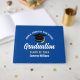 Este moderno libro de invitados para la fiesta de graduación de personalizados blancos y azules presenta el nombre de la escuela secundaria o la universidad para la clase de 2025. Personalizar con tu año de graduación bajo el guión manuscrito de la moda y gorro negro para un gran regalo personalizado para graduados.