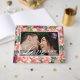 Bonito y vibrante melocotón y acuarela rosa flores y vegetación enmarcan la foto de la feliz pareja. El elegante guión de amor, la fecha boda y los monogramas son un hermoso overlay en este moderno diseño. En esta colección se pueden encontrar invitaciones y accesorios de coordinación.