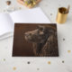 El diseño presenta un retrato fotográfico de un perro con el pelo castaño sobre un fondo marrón oscuro.