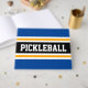 Este diseño deportivo presenta texto atlético de PICKLEBALL dentro de una amplia franja de carreras de centro horizontal negra con rayas brillantes amarillas y blancas adosadas contra correas de borde exterior azul audaz. Los colores y el texto de este diseño se pueden personalizar.