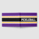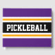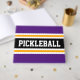 Este diseño deportivo presenta texto atlético de PICKLEBALL dentro de una amplia franja de carreras de centro horizontal negra con rayas brillantes amarillas y blancas adjuntas contra rayas reales de borde exterior violeta. Los colores y el texto de este diseño se pueden personalizar.