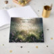 La luz solar suave se filtra a través de un bosque nublado iluminando un prado de delicadas flores moradas y exuberantes hierbas verdes para un funeral o un servicio conmemorativo. Se puede cambiar todo el texto.