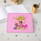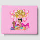 Ilustracion de una adorable bebé vestida de rosa, con el pelo en bollos con arcos rosas y tiara princesa. Rodeado de juguetes y con globos rosados y dorados encima con estrellas y pancartas lunares. Un regalo lindo para los padres que esperan, la ducha de bebé, la revelación de género o el regalo de cumpleaños del bebé.