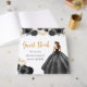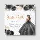 This quinceanera guest book features a beautiful princess in a black ball gown with floral arrangements. This is perfect for a quinceanera birthday party.