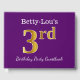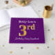 El diseño de este libro de huéspedes incluye el número ordinal "3rd" con un aspecto de oro falso. También tiene un nombre personalizado y un fondo morado. Se podría usar en un fiesta para alguien que celebre su tercer cumpleaños. [~Z0000057]
