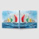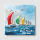 Una flota de veleros con veleros vibrantes en rojo, verde, amarillo y azul se desliza a través de un mar agitado bajo un cielo despejado. Se puede cambiar todo el texto.
