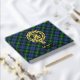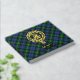 Insignia escudo del clan Gordon rodeada por una correa y hebilla sobre fondo tartán. texto frontal, espalda y columna vertebral personalizado.