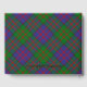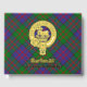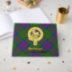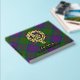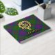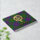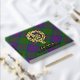Insignia escudo del clan MacDonald rodeada por una correa y hebilla sobre fondo tartán. texto frontal, espalda y columna vertebral personalizado.