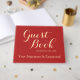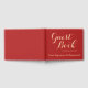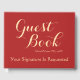 Este sencillo libro de visitas incluye los mensajes "Libro de invitados" y "Se solicita tu firma", junto con una fecha personalizada. El texto es de color marrón y el fondo es de color rojo. Un libro de personalizables genéricos como este podría ser usado en un evento como una reunión familiar, una celebración del aniversario del boda, un funeral, una fiesta de cumpleaños o algún otro evento.