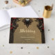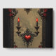 Romance gótico: Pasión oculta. Marco ornamentado de estilo gótico, diseñado con fino filigree negro, con líneas delicadas y detalles intrincados que recuerdan a antiguas y ornamentadas tallaciones. En el marco se han colocado rosas rojas brillantes, con flores de terciopelo que crean un contraste vibrante con el violín oscuro, resaltando el ambiente romántico. Los adornos en forma de corazón adornan las esquinas y los bordes del marco. Dos velas negras con llamas rojas brillan suavemente, dando a la imagen general un toque cálido y ligeramente sombrío.