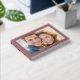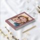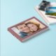 This wedding guest book features a classic and romantic design with a central photo placeholder framed by a thick maroon border. The layout includes elegant, gold serif typography at the top and bottom, adding a touch of luxury to the warm, inviting photograph within. The color palette combines rich maroon with soft, light tones from the image, creating a sophisticated yet joyful atmosphere perfect for celebrating love and unity on your special day.