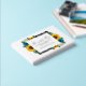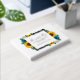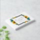 El diseño presenta elegantes girasoles, rosas y margaritas con una paleta de colores dorados amarillo, verde azulado y blanco. El diseño también incluye un marco gris de carbón vegetal. Puede cambiar el color de fondo en la parte delantera y de vuelta al color de su elección o dejar ambos en blanco.