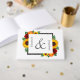 El diseño cuenta con elegantes girasoles, rosas y flores silvestres con una paleta de colores dorados amarillos, rojos y naranjas. El diseño también incluye un marco gris de carbón vegetal. Puede cambiar el color de fondo en la parte delantera y de vuelta al color de su elección o dejar ambos en blanco.