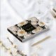 Un diseño sencillo pero llamativo y elegante, sin costuras, con grandes flores de marfil blanco rosado en flor, con estambres de melocotón pálido, colocado sobre un fondo de hoja verde profundo, con una entrada cuadrada negra bordeada por un verdadero Relieve metalizado dorado. Una plantilla de texto para la redacción de su personalizado dice "libro de invitados" en la parte delantera y su título personalizado aparecerá en la columna vertebral, que también es de color negro. Ambas plantillas de texto son un verdadero Relieve metalizado que crea un aspecto atemporal y lujoso en la portada. Es ideal para un "boda floral"; un aniversario de campo; una cena de estilo barroco vintage o rococó o un evento de negocios de gala inspirado en la flor de la naturaleza / función de fin de año. Disfrute de los recuerdos con este elegante y a medida. Los colores del Relieve metalizado y del tipo de letra pueden cambiarse a oro plateado o rosa y las páginas pueden pasar de estar alineadas a estar en blanco o incluso a ser de color negro si se utilizan sharpies metálicos para añadir un poco de lujoso glamer a las páginas.