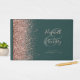 Este elegante libro de invitados para bodas presenta un borde izquierdo de falso rosa purpurina de oro sobre un fondo verde oscuro. Personalizar fácilmente el texto rosa rosa con los nombres de la novia y el novio en una caligrafía de escritura a mano caprichosa sobre un gran ancho de banda. Añade texto adicional de su elección al frente y a la columna vertebral.