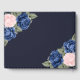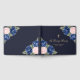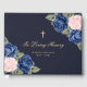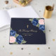 Libro de visitas conmemorativo/fúnebre floral azul y dorado elegante con una cruz dorada, rosas azules y rosadas de acuarela y flores de aliento de bebé sobre un fondo azul oscuro.